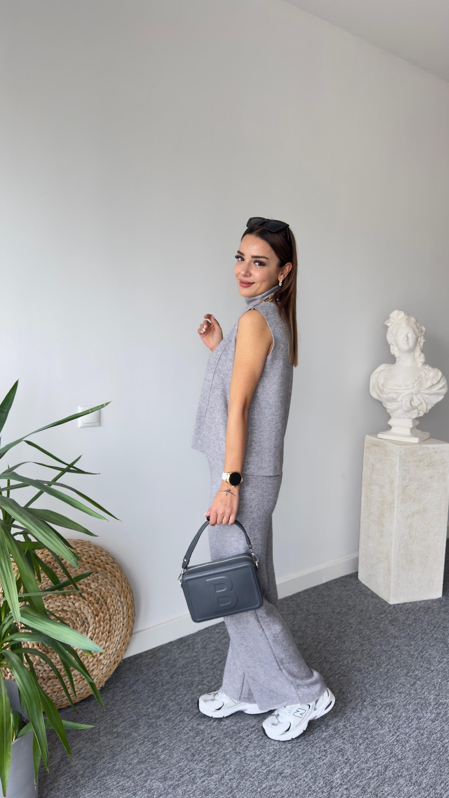 Ensemble sans manches gris à col roulé en tissu doux